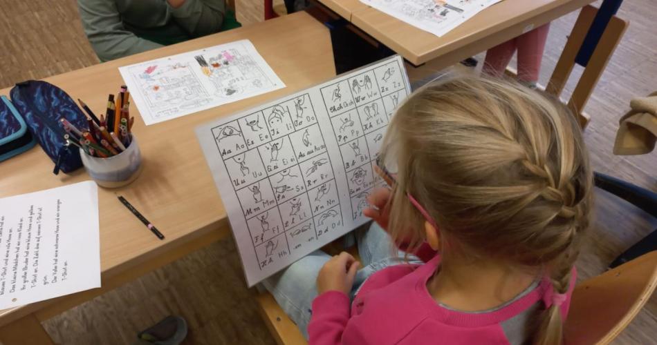 Ganz spontan nahm eine Schülerin im Unterricht die Tabelle der Lautgebärden und übte mit den anderen Kindern die Lautgebärden und das Lesen. Kinder helfen Kindern - das Beste am Unterricht!