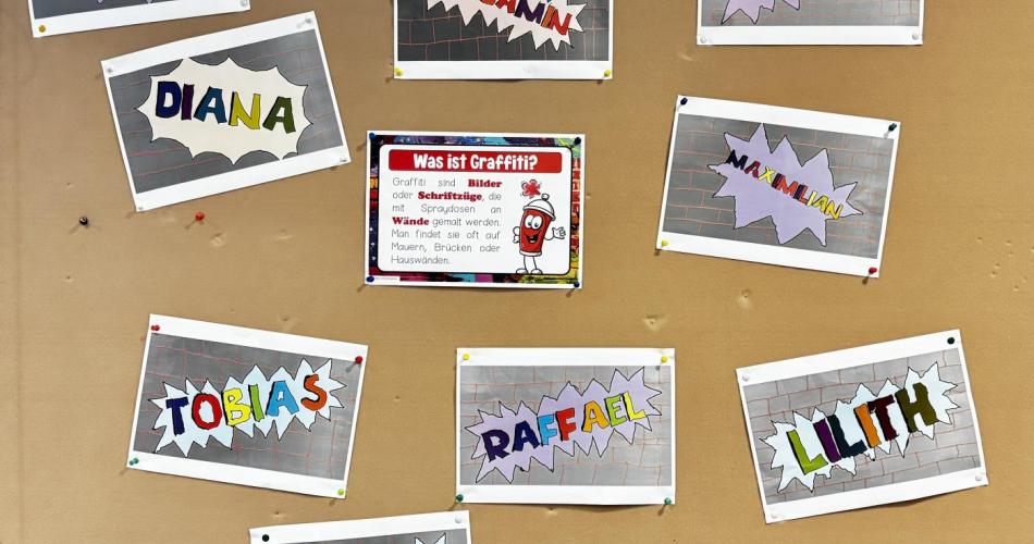 Im Fach „Digitale Grundbildung“ gestalteten die Schülerinnen und Schüler der E2 ihr eigenes Namensgraffiti. Die Kinder sind auf ihre Werke sehr stolz!